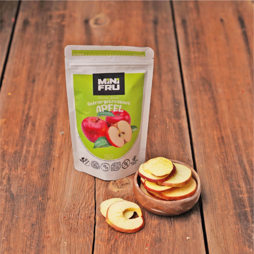 Freeze Dried Apple Hver Minifru frysetørket frukt pose tilsvarer omtrent 2-3 hekto fersk frukt! 100% frukt
