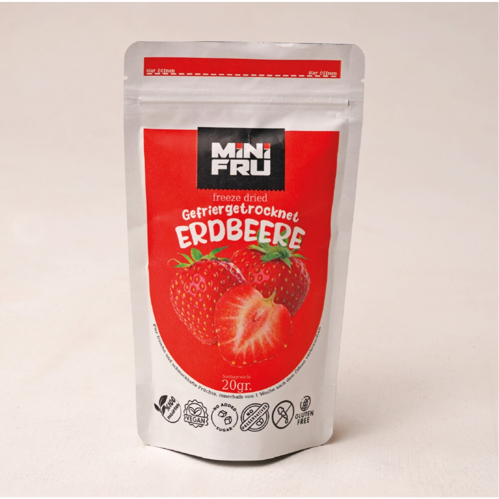 Freeze Dried Jordbær Hver Minifru frysetørket frukt pose tilsvarer omtrent 2-3 hekto fersk frukt! 100% frukt
