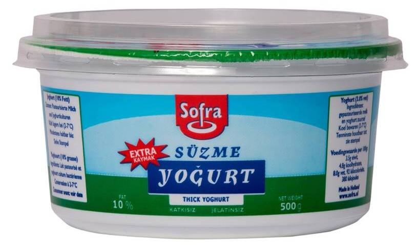 Süzme (thick) yoghurt (10%) 500 GR Our rich and velvety 'süzme' Turkish yogurt is a dense, full-bodied yogurt boasting a luxurious 10% fat content. 500 Gr