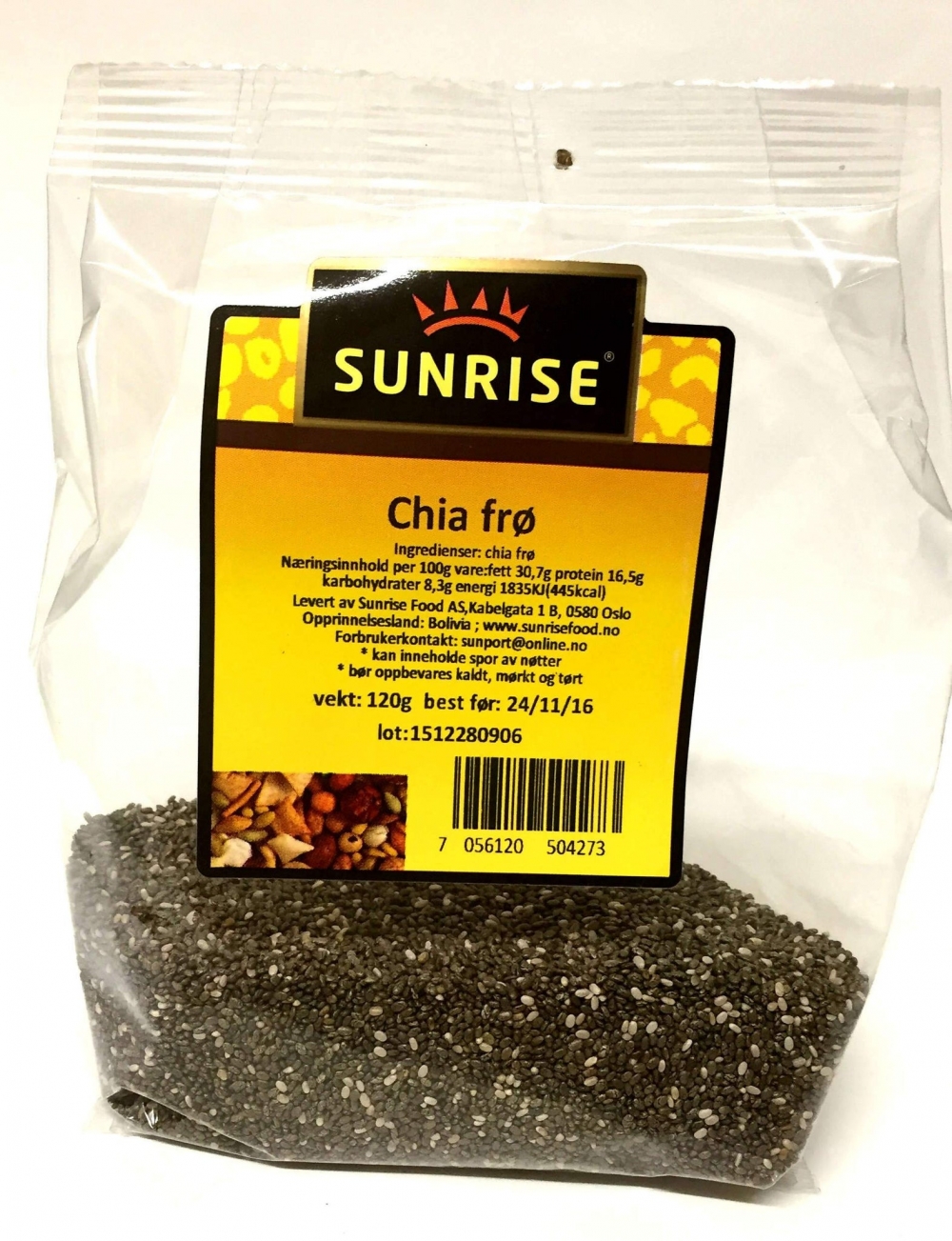 Sunrise Chiafrø 120 g – Små, næringsrike og kraftfulle superfrø Fyll dagen med naturlig energi med Sunrise Chiafrø 120 g. Disse små superfrøene er fulle av omega-3, fiber, protein og viktige mineraler – perfekt for deg som ønsker et sunt og balansert kost