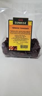 Produktbeskrivelse Sunrise tørkede tranebær i pose på 195 g. Tranebær brukes ofte som snack, i frokostblandinger, bakst, kaker eller i salater for å tilføre en søt-tart smak.